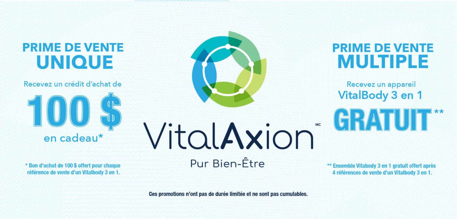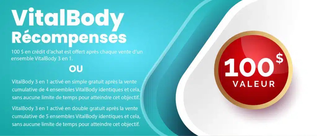 - 100 $ en crédit d’achat est offert après chaque vente d’un ensemble VitalBody 3 en 1.