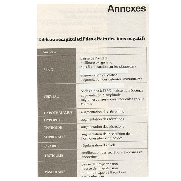 Les ions négatifs agissent favorablement sur le niveau de sérotonine, sur les glandes endocrines, sur le cycle de Krebs, sur l’oxygénation des tissus, sur le système nerveux végétatif (SNV) et sur les échanges cellulaires. Une excellente denrée dynamisante pour les sportifs, les gens âgés, les malades et quiconque en quête de bien-être. »