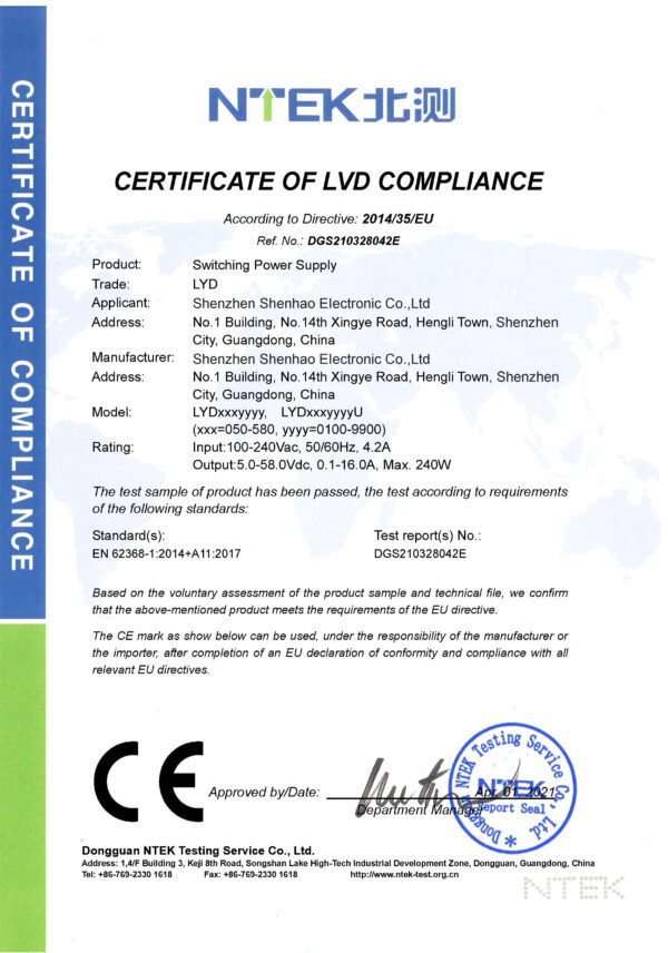 - Powerful Universal power Supply converter 240 W/24V/10A UL, FCC, and CE certified;